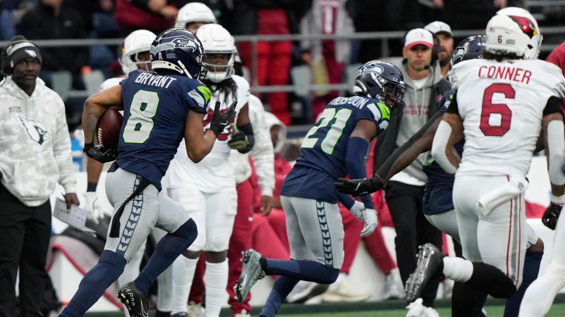 Coby Bryant does 'Beast Mode' celebration after 69-yard pick-six